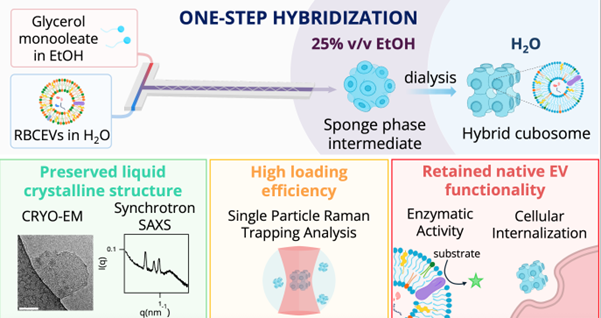 Liquid-crystalline lipid nanoparticles (LCNPs), specifically cubosomes, have a bicontinuous cubic internal structure which provides high cargo-loading capacity, a large internal surface area and membrane curvature that can improve drug delivery inside cells. But LCNPs lack the biocompatibility and targeting properties of EVs.